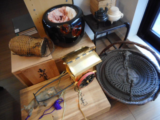 ご依頼主様とともに各場所に保管されておられたお道具を一点ずつ拝見し、お道具についての説明などをお話ししながら仕分けをしていきました。各場所ごとに見積もりをしていきながらご納得いただき沢山のお道具類をお譲りいただけることになりました。