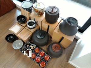 拝見させていただきますと、外箱などは経年変化から汚れもありましたが、中身は梱包状態から新品のまま保管されていたことがうかがえました。つまりは新品状態でしたのでとても綺麗なお茶道具たちで、茶釜、茶碗、水指などまだまだ活躍できるお茶道具たちでした。ランクとしましてはお稽古道具なのですが、新品・未使用ということもあり少し査定額を上げることができました。このことを口頭でお伝えすると大変喜んでいただき沢山のお茶道具をお譲りいただくこととなりました。