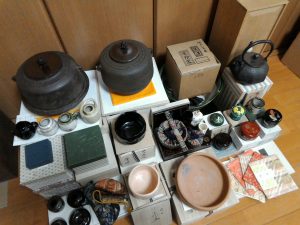 茶道教室を開くに当たって集めてこられたお茶道具たちで、お稽古道具が中心でしたが、ほとんど使用されていないお茶道具が沢山ありこれからまだまだ活躍できるお道具たちばかりでした。お稽古道具はまとめての評価になりやすいのですがその中でも、箱に入っていない裸のお道具と紙箱などに入っているお道具たちをまとめ、続いて木箱入の茶碗などのお道具たち、茶釜、鉄瓶、そして消耗品類と一点ずつ拝見させたいただき、わかりやすく仕分けをさせていただき、それぞれ種類ごとのまとめてではありますが評価・査定させていただきました。