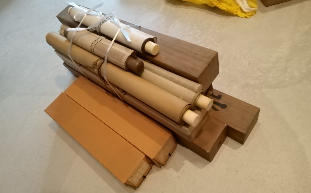 当日ご訪問させていただき、早速お話をうかがいながらお道具を拝見させていただきました。内容としては茶碗、棗、風炉釜、鉄瓶、掛軸他消耗品類とありお稽古道具が中心でございました。それらを種類ごとに仕分けさせていただき査定しました。