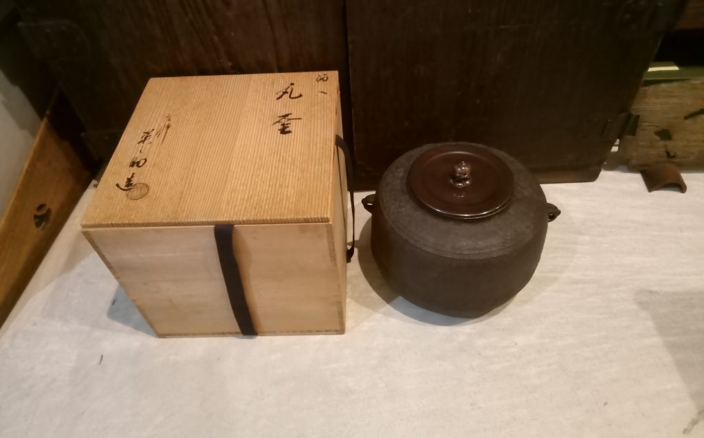 拝見させていただきましたところ、内部に錆びはあるもののまだまだ使える一品で、表面はおしまいの際の手入れが行き届いている様子がうかがえました。以前は市場でも売れている釜師であったのですが、近年の茶道具価格の低迷により大変安くで取引されているのが現状です。もちろん一点で評価はできますが、それらをふまえてわずかな評価額となりましたが、ご納得いただきお譲りいただけることとなりました。