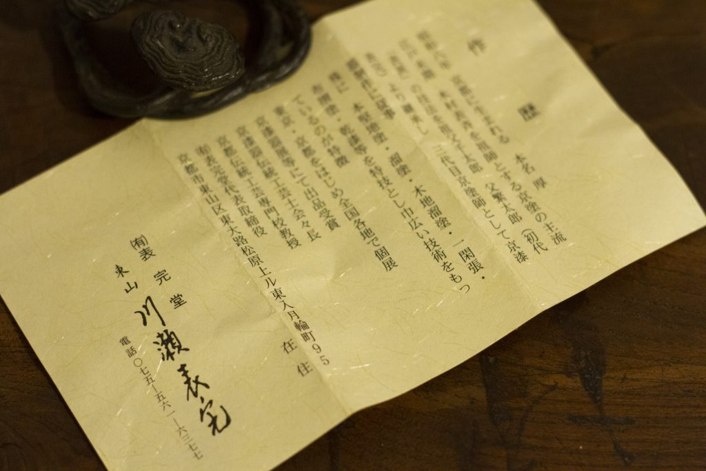 昭和八年、京都に生まれる。江戸末期、木村表斉を祖師とする京塗の主流「表派」の技法を祖父の千太郎、父繁太郎(初代表完)より継承し、三代目京塗師として京漆器制作に従事。幅広く技術を特徴。平成七年没。