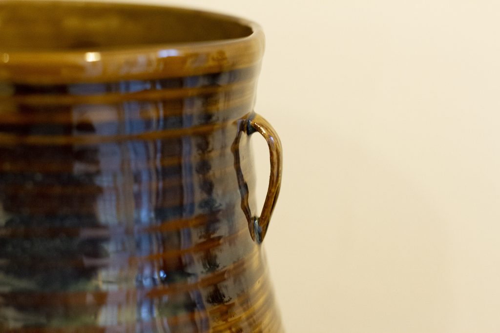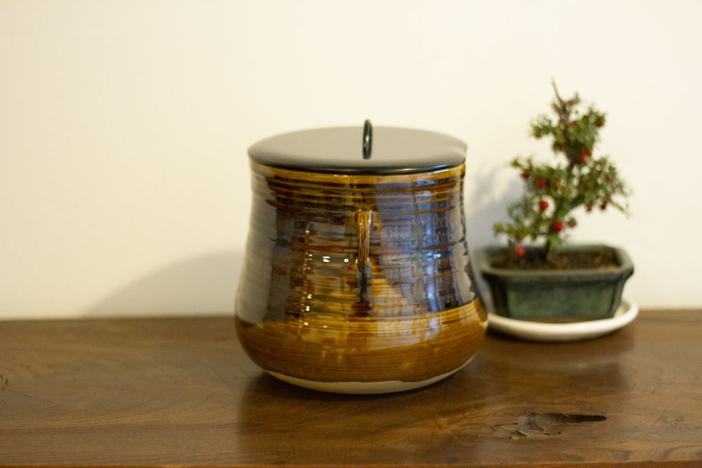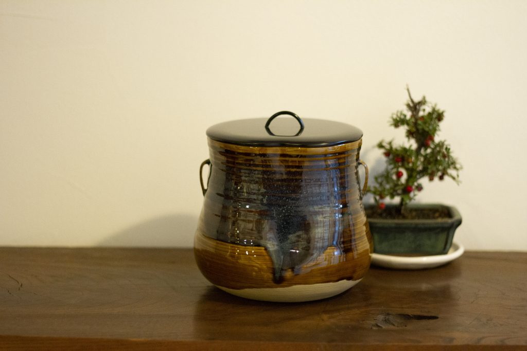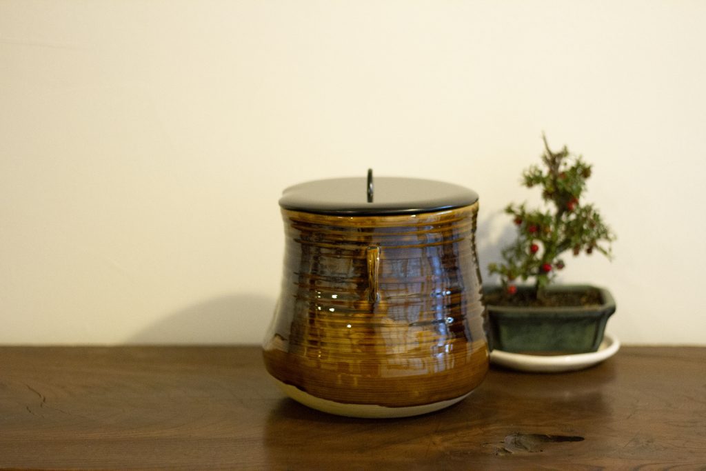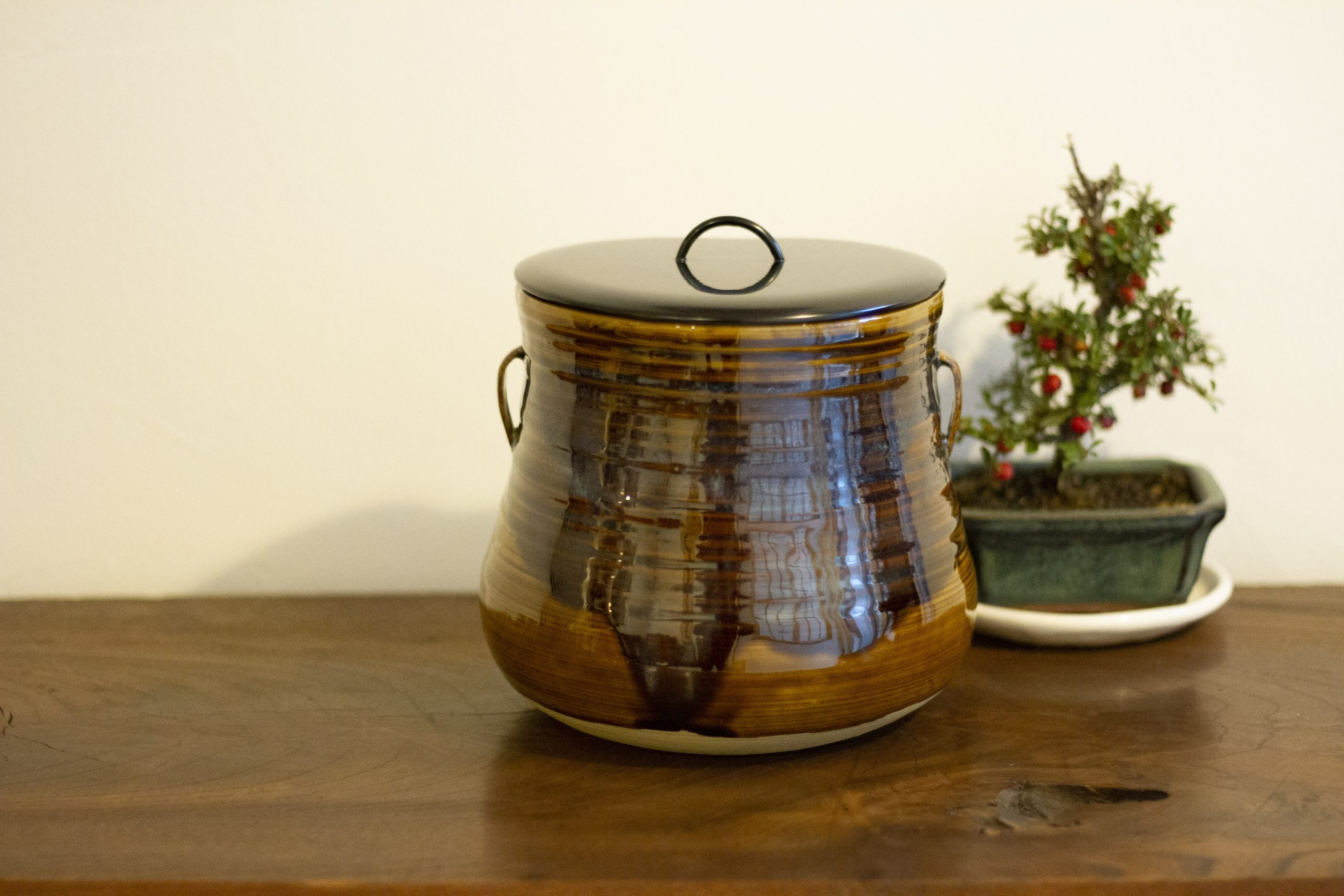 亀井楽山 昭和二十年、高取焼十四代亀井味楽の弟して福岡に生まれる。兄に師事し作陶を始め昭和三十七年、福岡県美術展に初入選。以後受賞歴・個展開催多数。昭和五十二年、大徳寺派管長方谷浩明老師より「楽山」の号を受ける。平成二年、楽山窯を築窯。平成二十六年、現代の名工の表彰を受ける。