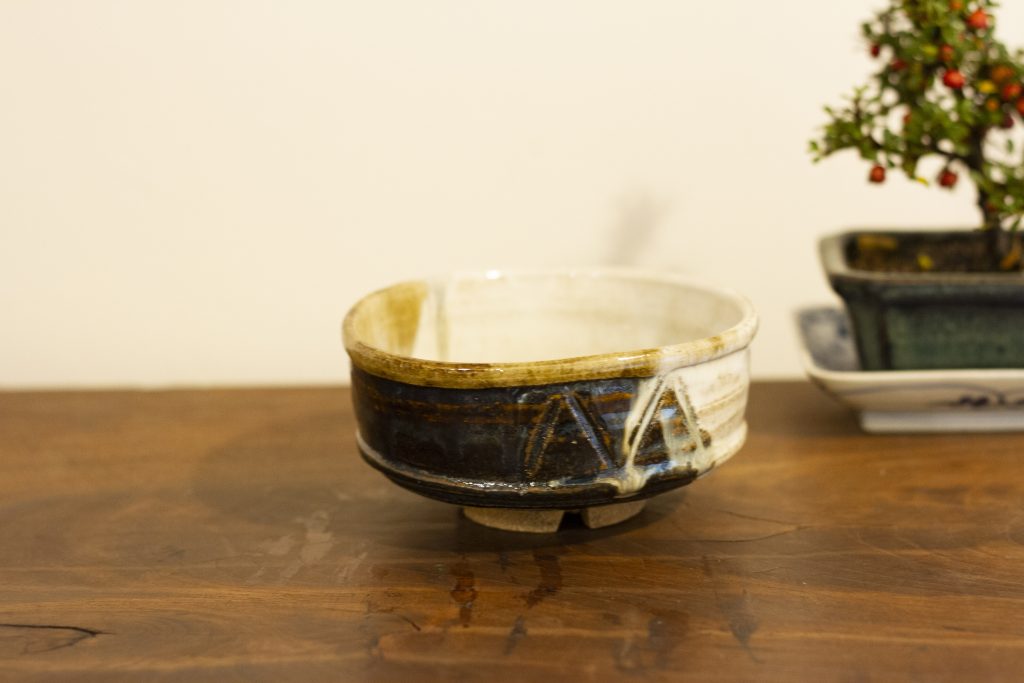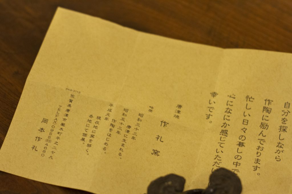 岡本作礼 佐賀県唐津市。一九五八(昭和三十三)年、唐津市に生まれる。昭和五十三年中里重利陶房にて修行、作陶を開始。一九八九(平成元)年、独立。唐津の現在地に窯を築く。各地にて個展を開催。